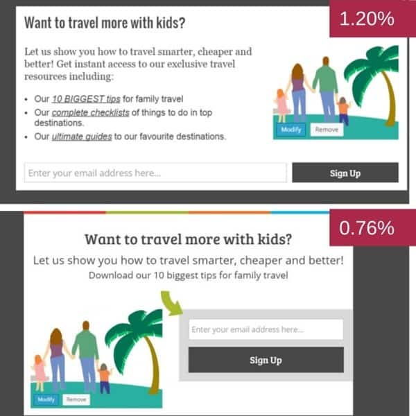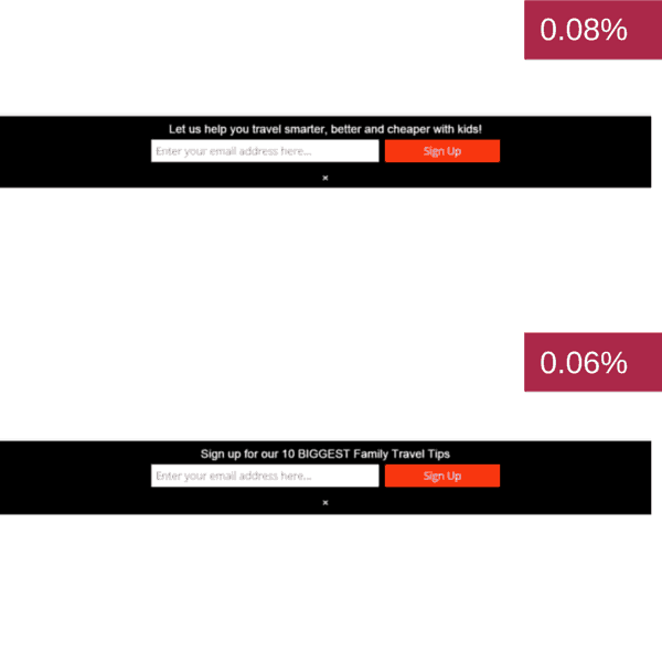 On the images below, you will find some of the different pop ups I have been split testing along with their conversion rate (how many people subscribed vs how many people saw the pop up)