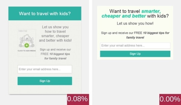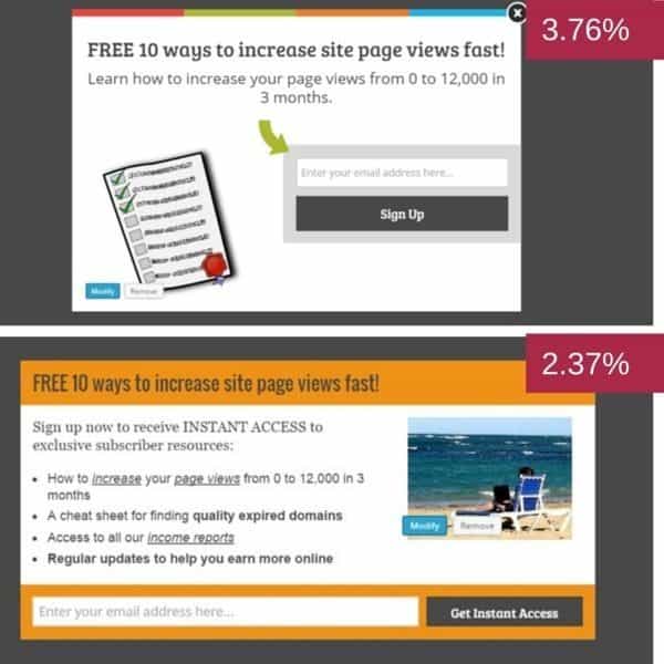 If you can afford to buy OptinMonster, definitely use the split testing capability. It will only take you a few minutes to set up some split tests and you can see below the difference in conversions you might experience.