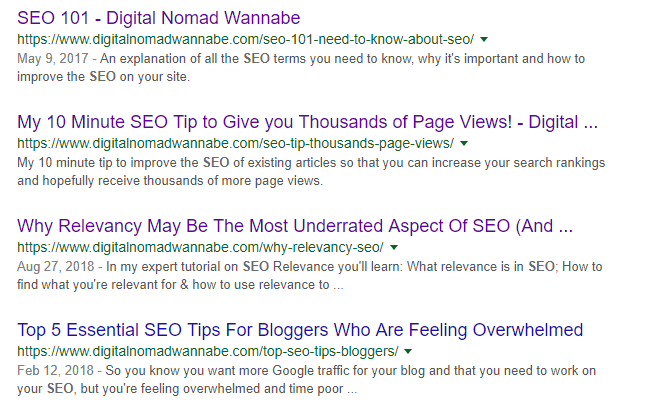 This for me was an easy win – when I started digitalnomadwannabe.com I wasn’t initially doing SEO, but relying on my email list, my Facebook group and word of mouth.  But every single item on this checklist has contributed in some way to that increase in traffic. (Download your Foolproof and Free SEO Audit Checklist NOW!)