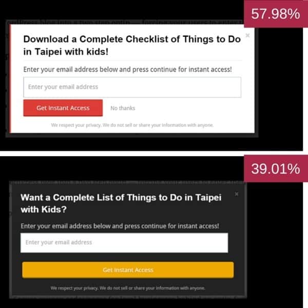 On the images below, you will find some of the different pop ups I have been split testing along with their conversion rate (how many people subscribed vs how many people saw the pop up)